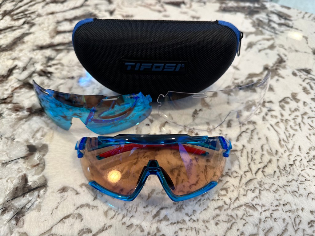 These glasses are great for running as they keep sweat from going directly into the eyes. They come with 3 lenses and they are easy to switch out.